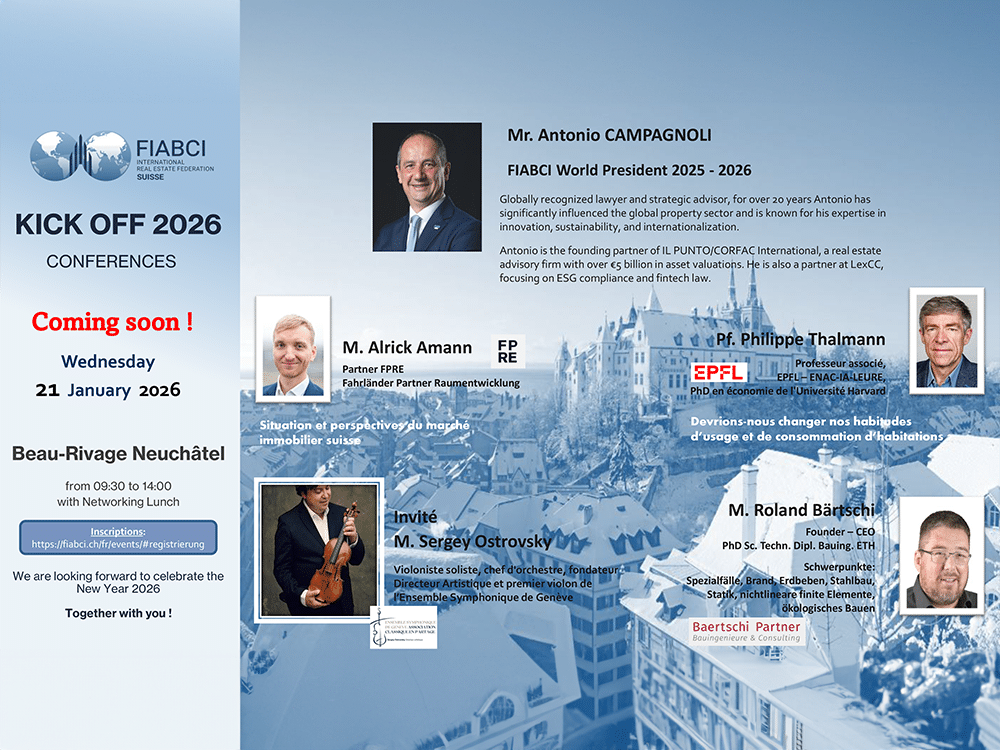 Freitag, 07.02.2025, Freiburg (Schweiz) Download Einladung/Invitation: DE | FR   Geschätztes FIABCI-Mitglied, sehr geehrte Gäste und Freunde Wir freuen uns, Sie wiederum im Namen der FIABCI-SUISSE für den traditionellen Kick-off Event 2025 mit den neusten Informationen und Aktualitäten zum Immobilienmarkt einzuladen und gleichzeitig auch auf das neue Jahr anzustossen. Wir